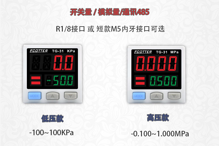 ECOTTER數(shù)顯壓力表有高壓款-0.1~1mpa 和 低壓款 -100~100kpa兩種量程不同的規(guī)格,低壓款常用于負(fù)壓檢測(cè)。這個(gè)系列產(chǎn)品有開關(guān)量、模擬量及通訊485款可選。