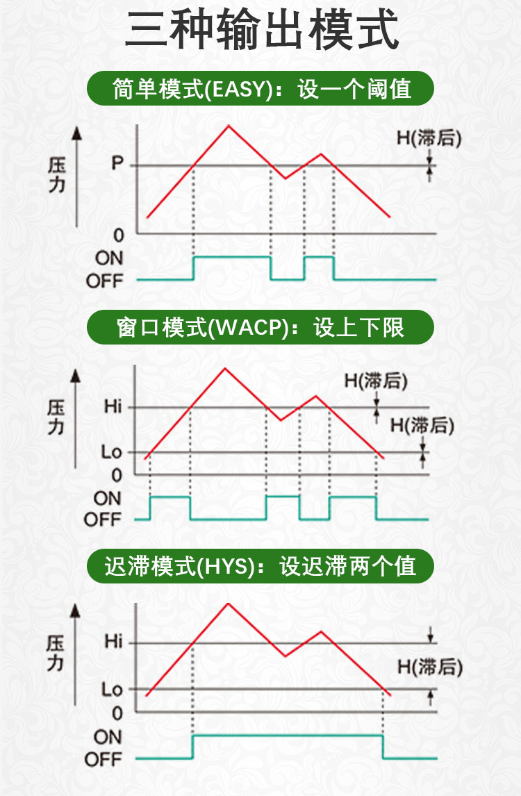 ECOTTER數(shù)顯壓力表可實(shí)現(xiàn)智能檢測(cè),多種輸出模式,簡(jiǎn)單模式可設(shè)置一個(gè)閥值,窗口比較模式能設(shè)上限和下限兩個(gè)閥值,進(jìn)行區(qū)間輸出。還有應(yīng)差模式,設(shè)置兩個(gè)閥值,起到遲滯的效果。