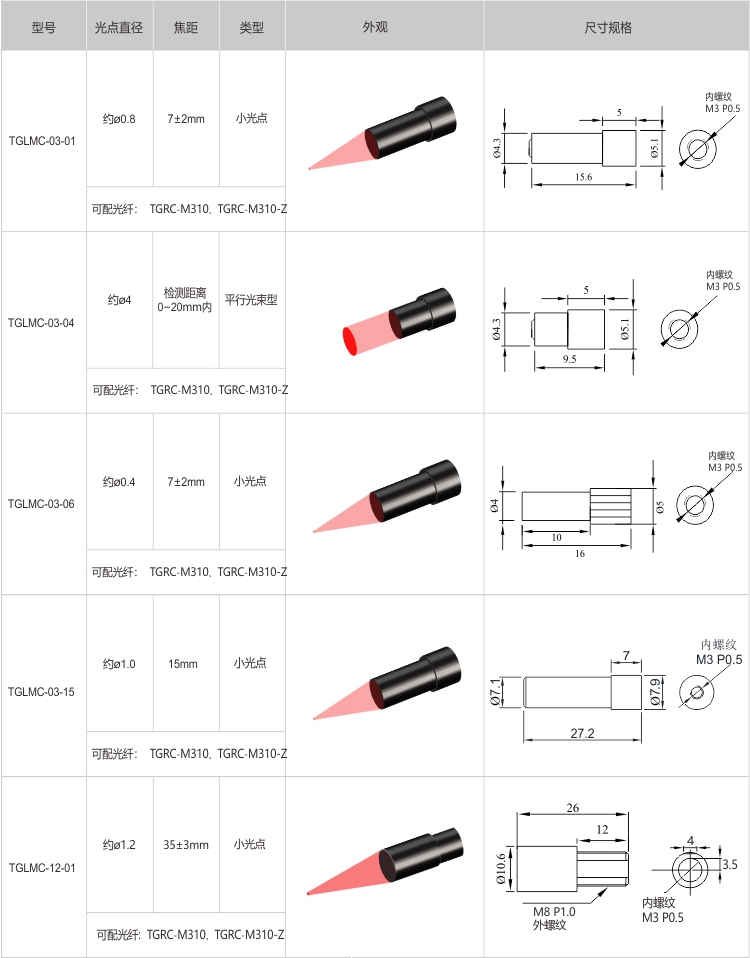 適用于M4對(duì)射光纖的聚光鏡,檢測(cè)距離可達(dá)6000mm。