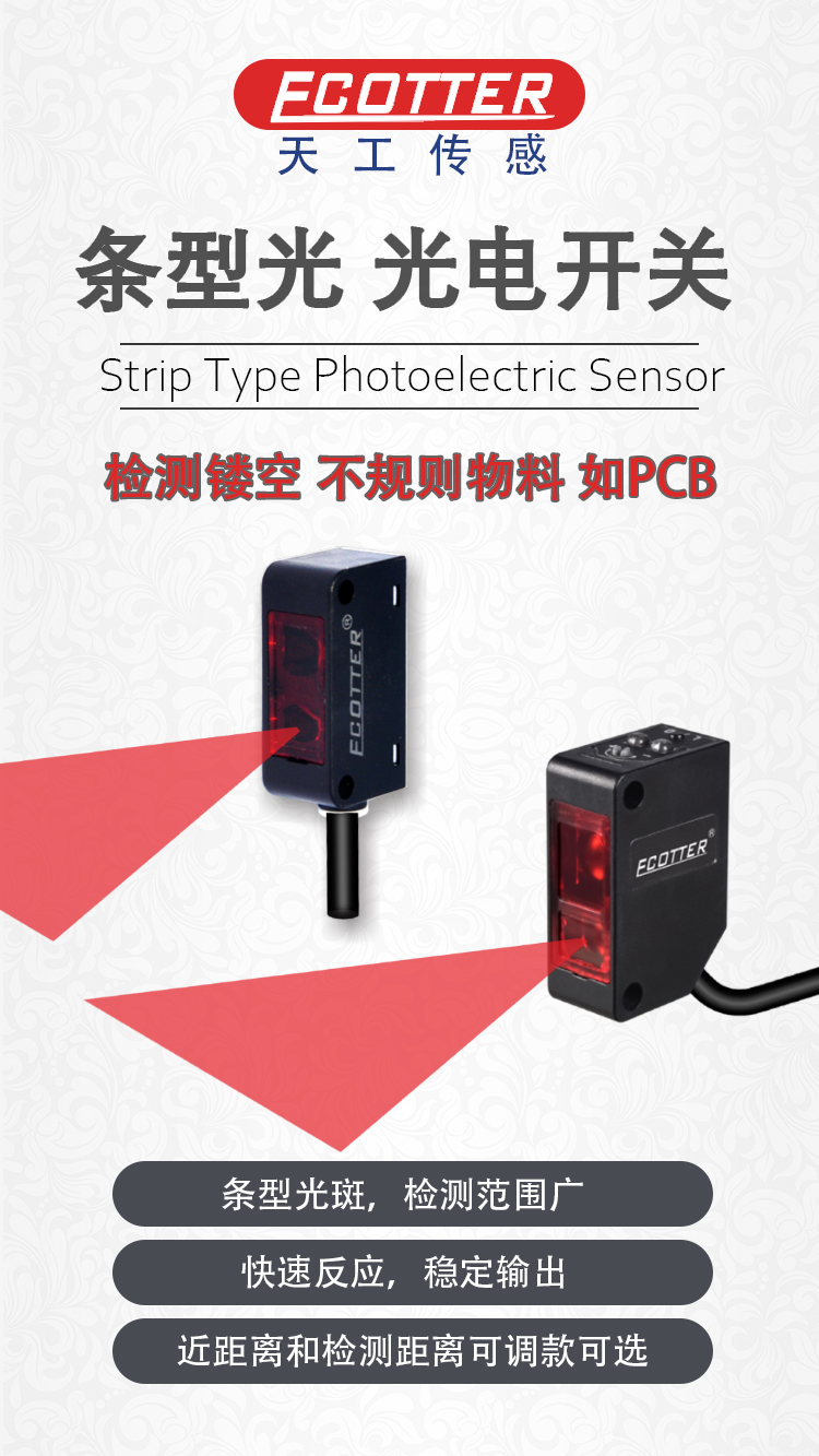 光電開關(guān)在檢測(cè)時(shí),只需要被檢測(cè)物體返回部分光就可以感應(yīng)到,而條形光光電開關(guān)的光斑是擴(kuò)散的,被檢物體的鏤空部分不會(huì)影響檢測(cè),不規(guī)格物體滿足條件同樣可以被感應(yīng)到。