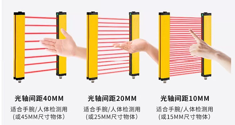 安全光幕通過不同光軸間距的選擇來決定保護(hù)的部位,光軸間距越來密集,保護(hù)的就越細(xì)致,根據(jù)光幕安裝的位置、離危險設(shè)備的距離選擇適合的款式。