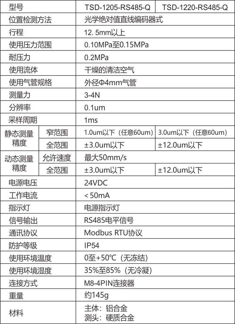 TSD-1205-RS485-Q為氣動型,由氣管接口可接直徑4mm氣管,通0.12~0.17mpa氣壓推出探桿,測量精度可達(dá)3um。支持RS485 modbus rtu ,可高速返回數(shù)據(jù)每秒1000次,實現(xiàn)動態(tài)測量。