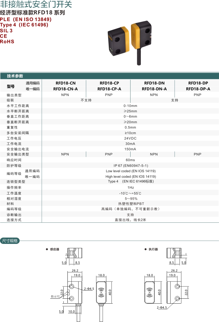 非接觸式安全門開關(guān)采用無線射頻識別應(yīng)用技術(shù),無論周圍發(fā)生何種變化,都要安全地進(jìn)行開關(guān),非接觸式安全開關(guān)工作穩(wěn)定可靠??梢愿鶕?jù)風(fēng)險評估和機(jī)器設(shè)計的要求使用。